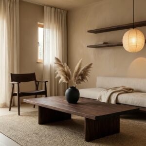Deep brown reflects the beauty of natural wood and craftsmanship. It adds richness and contrast, especially against lighter walls. This tone reinforces Japandi’s emphasis on authenticity and organic materials.