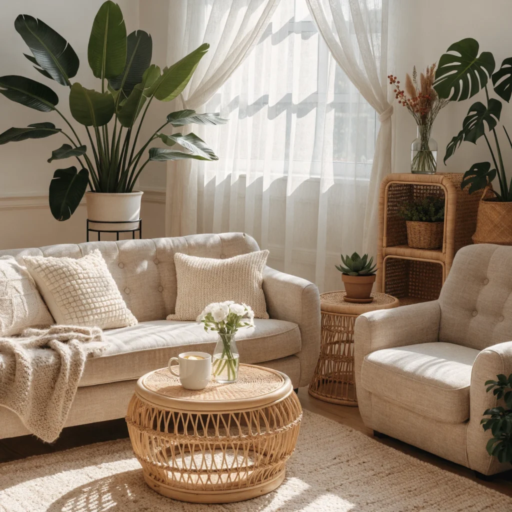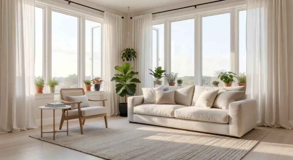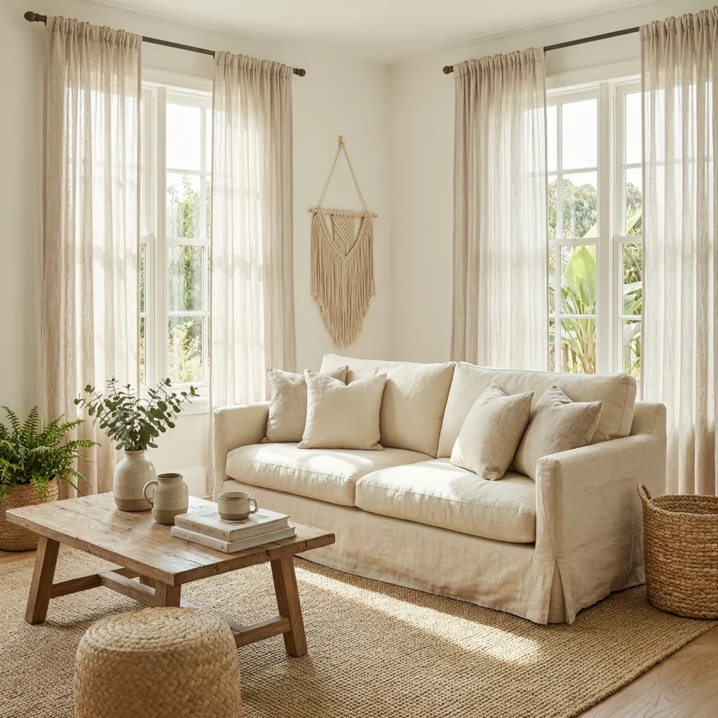 Combine sheer curtains with natural textures like wood and rattan. The flowing fabric enhances the sense of openness and helps transform your living room into a fresh seasonal sanctuary.
