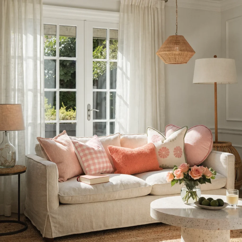 Pastel tones like blush, sage, and sky blue are trending for summer textiles. Throw pillows are an easy way to add color and softness.