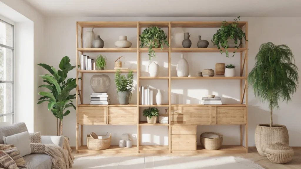 Open shelves create a light and organized display area. Use books, plants, and neutral décor pieces for a curated look.