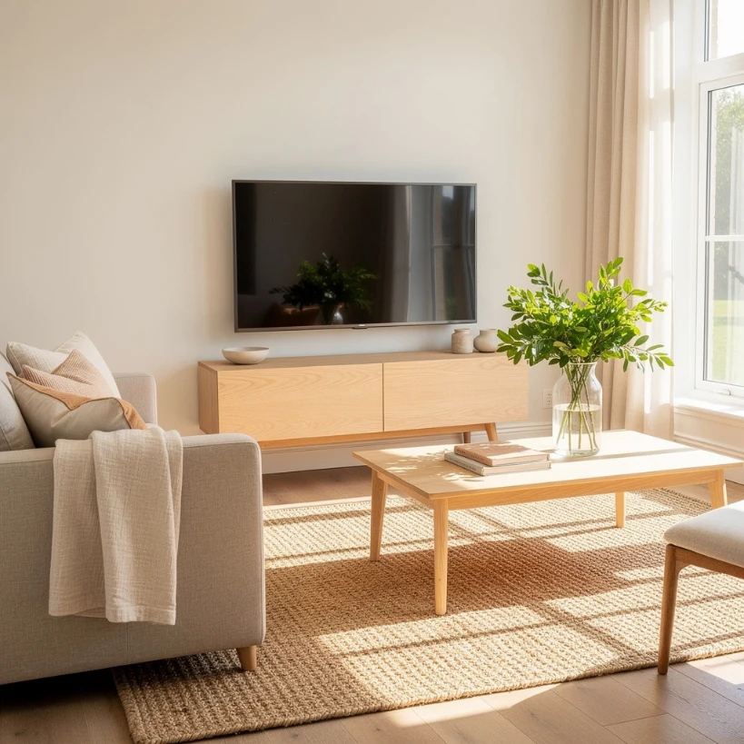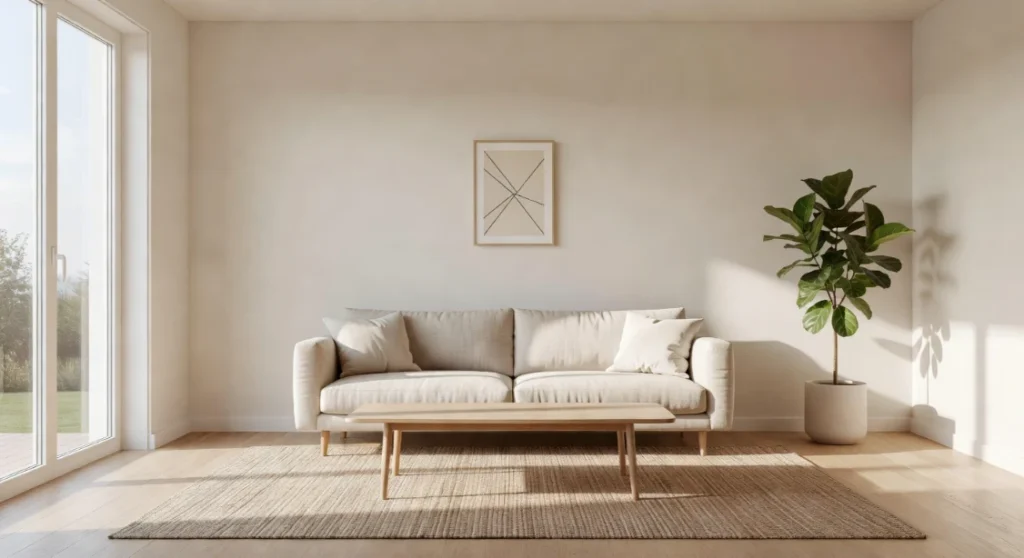 Minimal wall art keeps the living room feeling calm and uncluttered. Simple prints featuring landscapes, abstract shapes, or coastal scenes work beautifully.