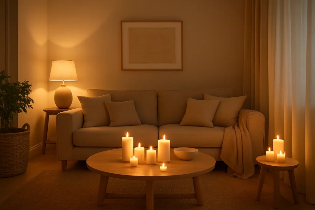 Place candles on coffee tables or shelves for ambiance. This small touch enhances comfort and seasonal charm.