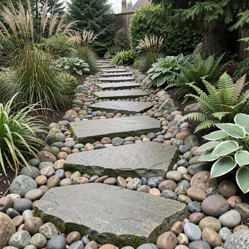 The variety of colours and sizes within natural river rock — grey, brown, cream, and rust tones all appearing together — creates a rich, textured surface that feels entirely organic. Ornamental grasses, ferns, and shade-loving hostas planted along the edges soften the boundary between path and planting bed, blurring the line between garden design and natural landscape. This walkway style suits woodland gardens, rain gardens, and Pacific Northwest-inspired planting schemes with particular elegance. It is a consistently popular idea on Pinterest among gardeners who prioritise sustainability alongside aesthetics.
