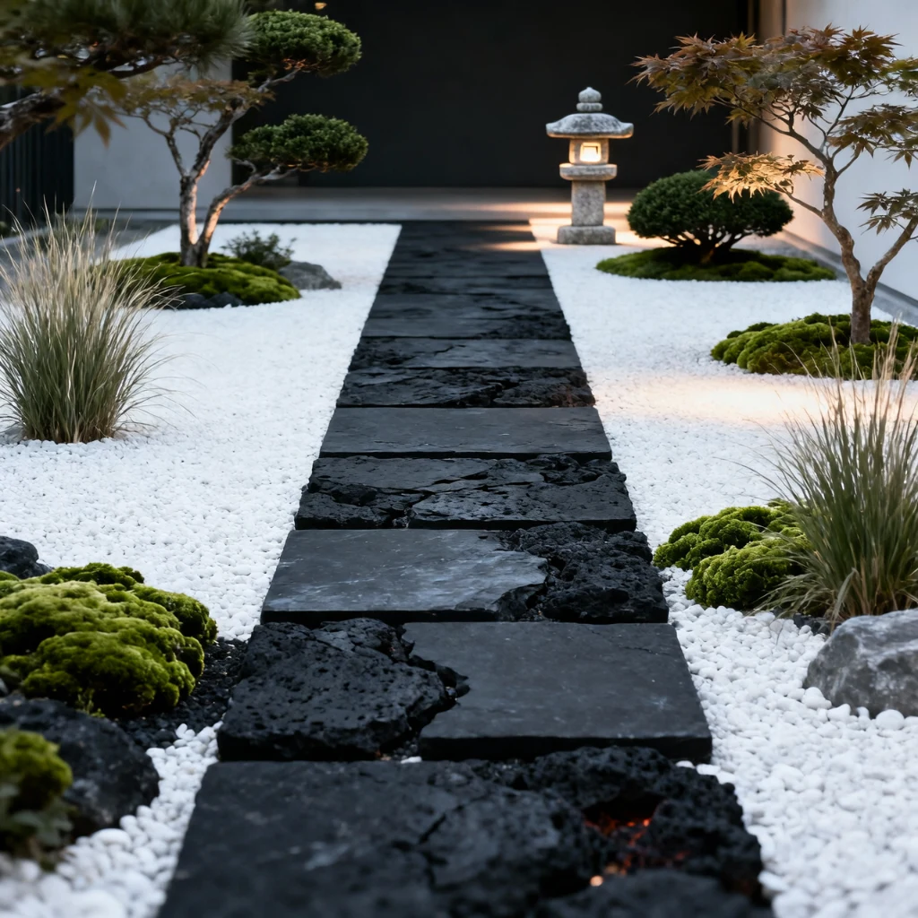 Basalt is also one of the hardest and most durable paving stones available, formed under intense volcanic pressure and essentially impervious to weathering, staining, or frost damage. Its naturally textured surface provides excellent grip even in wet conditions. In a contemporary Japanese or minimalist garden, black basalt pavers paired with pale gravel, raked sand, and carefully positioned boulders create a landscape of meditative beauty. This striking walkway material is gaining rapidly growing popularity on Pinterest’s luxury garden and contemporary landscape design boards.