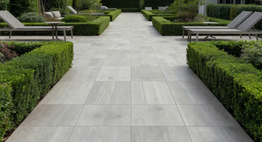 Large format outdoor porcelain tiles bring interior design standards of finish and precision to the garden walkway. Available in an enormous range of finishes — from realistic stone and concrete effects to wood-grain textures — porcelain tiles allow homeowners to achieve any aesthetic in the garden with consistent colour, uniform format, and exceptional durability. Unlike natural stone, porcelain is non-porous, frost-proof, and virtually maintenance-free, requiring only occasional washing to keep it looking as pristine as the day it was laid.