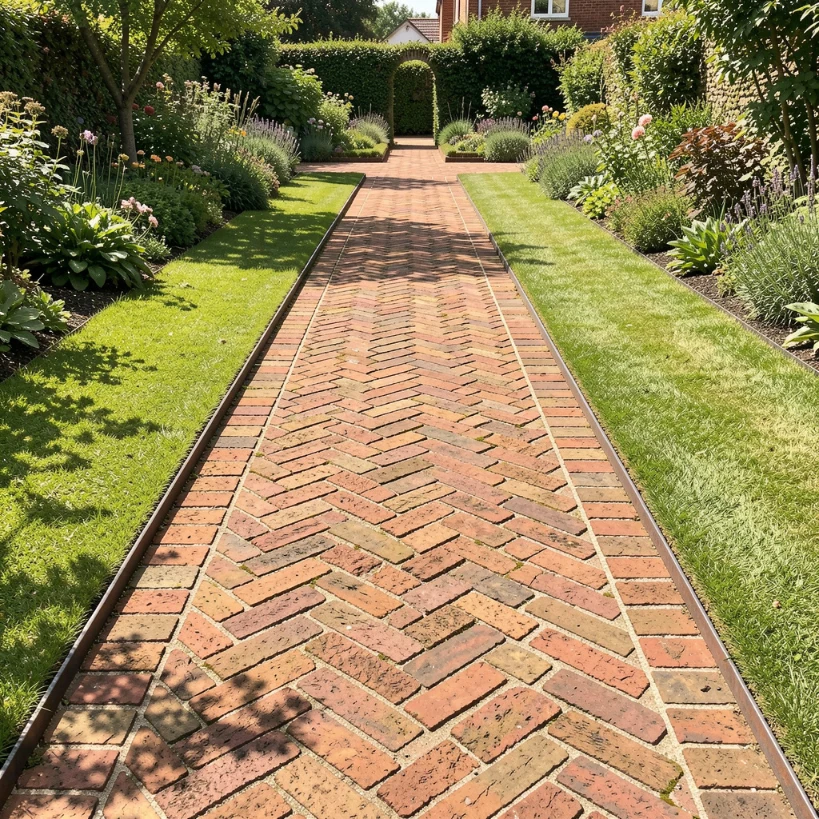 The warm red, terracotta, and brown tones of traditional clay brick complement virtually every garden style, from formal English gardens to relaxed cottage landscapes. Steel or aluminium edging strips keep the brick pattern clean and prevent the edges from spreading over time. For a more contemporary twist, choose grey or charcoal engineering bricks and lay them in the same herringbone pattern — the result is a walkway that feels modern without losing the classic appeal of the brick format. This pathway idea suits front gardens and backyard entertaining areas equally well.