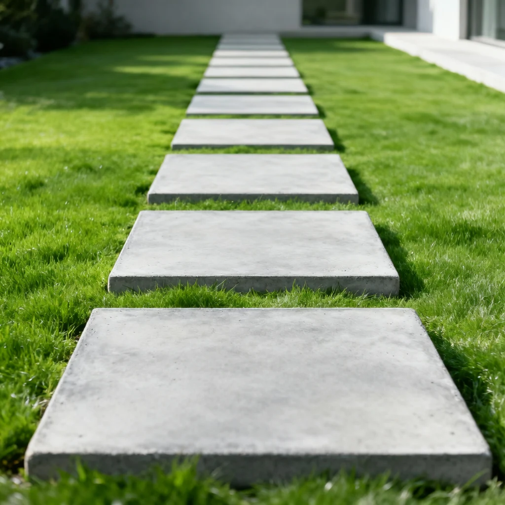 Large format concrete stepping stones placed across a green lawn create one of the cleanest, most architecturally satisfying walkway effects in modern landscape design. The simplicity of square or rectangular grey concrete pavers against vibrant green grass is visually striking in its restraint — a deliberate, graphic composition that feels designed rather than accidental. This walkway style suits contemporary and minimalist outdoor spaces beautifully, particularly in gardens designed around clean lines and open space.