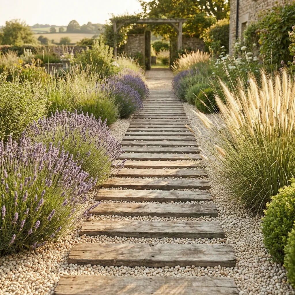 Timber sleepers define the edges and structure of the path, preventing the gravel from spreading into surrounding planting beds. The gravel itself provides excellent drainage — an important practical consideration for pathways in wet climates. As the timber ages naturally, it develops a silver-grey patina that becomes increasingly beautiful over time. Lavender, ornamental grasses, and other soft planting along the edges of this walkway style create a sensory-rich garden experience that is among the most-pinned outdoor path aesthetics on Pinterest worldwide.