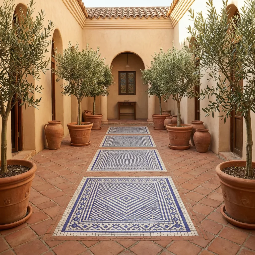 A mosaic tile inlay walkway transforms an ordinary outdoor path into a genuine work of art. By embedding decorative mosaic panels within a framework of standard pavers or terracotta tiles, you create a pathway with the kind of craftsmanship and individuality that cannot be manufactured or replicated. This style draws heavily from Mediterranean, Moroccan, and Spanish design traditions, where decorative tilework has been used to beautify outdoor spaces for thousands of years.