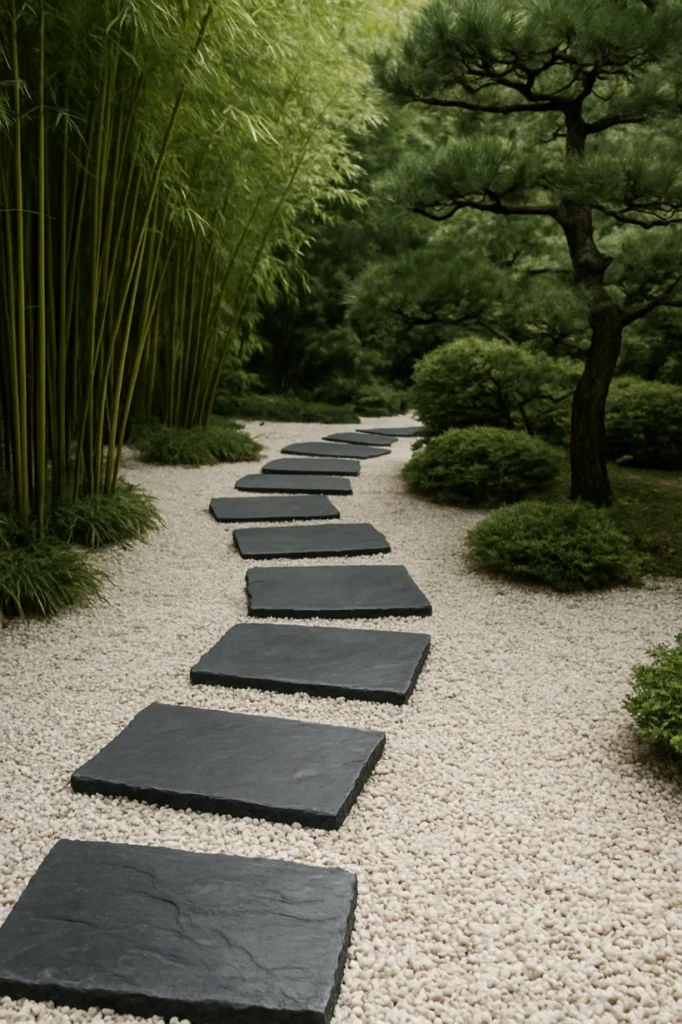 Bamboo, black pine, ornamental grasses, and carefully placed river stones complete the Zen-inspired landscape around this style of walkway. The slight elevation of each stepping stone above the gravel surface creates an interesting tactile experience underfoot — walking the path becomes a mindful, intentional act rather than a hurried transit. Slate is naturally slip-resistant when wet, making it an excellent practical choice as well as a beautiful one. This walkway style is among the most-saved garden path ideas on Pinterest by fans of Asian-influenced and meditative garden design.