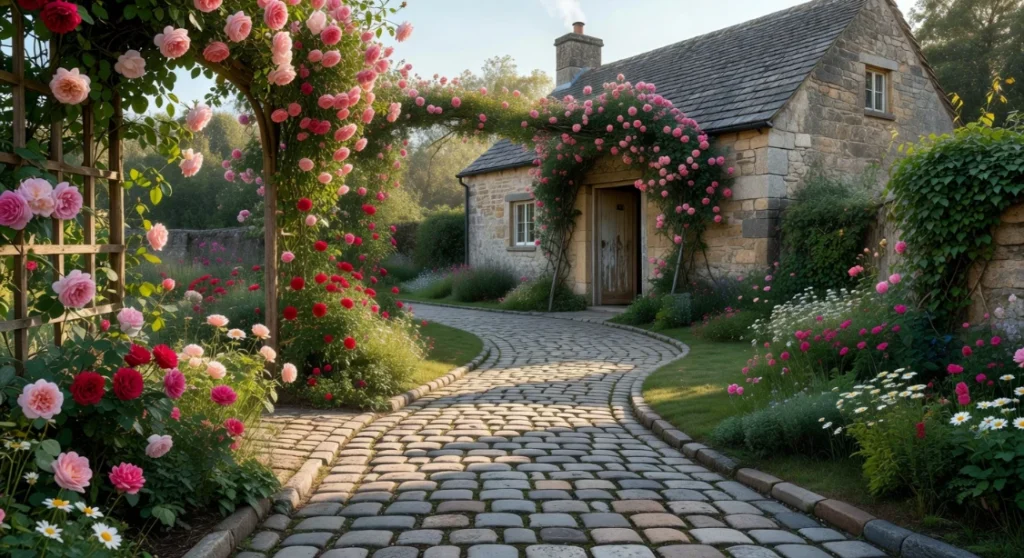 Buff limestone, grey sandstone, York stone, and reclaimed slate are all popular materials for crazy paving, each offering a different colour story and surface texture. The irregular, organic quality of this walkway style suits cottage gardens, farmhouse outdoor spaces, and any landscape where a sense of age and informality is desirable. When crazy paving paths are well executed, they have a quality of artistic spontaneity that feels genuinely unique — no two paths are ever the same. This cottage-garden staple remains one of the most-searched walkway ideas on Pinterest among fans of traditional British garden design.