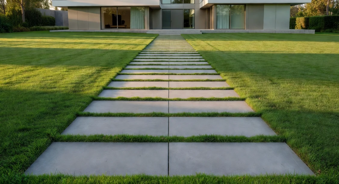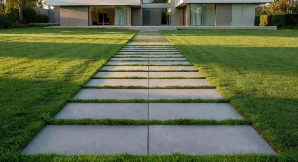 Concrete pavers with grass growing between the joints create a walkway that seems to dissolve into the lawn — a seamless integration of hard landscaping and soft planting that feels effortlessly modern. Setting the pavers flush with the surrounding turf level is the critical detail that makes this effect work. The grass fills the gaps naturally and is trimmed level with the paver surface, creating a grid-like pattern of grey concrete and green that is graphic, elegant, and deeply satisfying to look at.