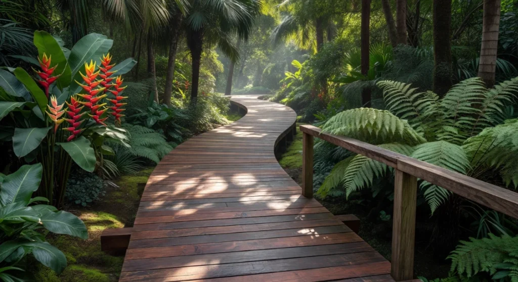 The warm golden and honey tones of natural hardwood complement lush tropical planting beautifully, creating a resort-like atmosphere in even modest suburban gardens. Composite decking offers a lower-maintenance alternative that retains its colour and resists warping and splitting year after year. Directional decking boards — running perpendicular to the direction of travel — add a subtle visual rhythm that draws the eye along the path. Garden boardwalk paths are among the most aspirational walkway ideas shared on Pinterest’s outdoor living and tropical garden boards.