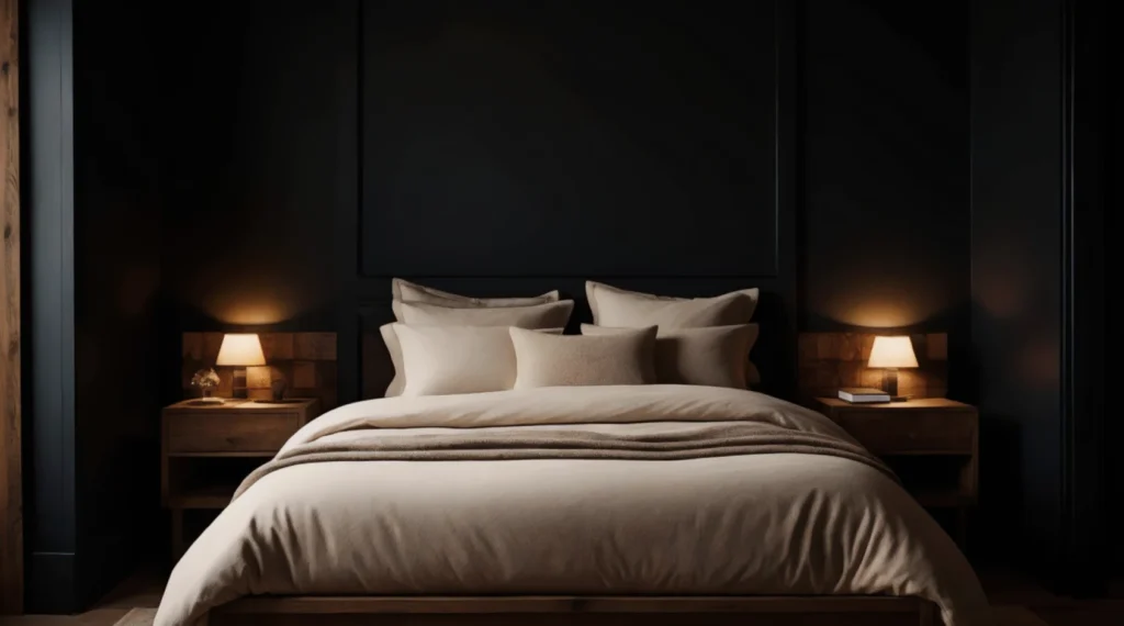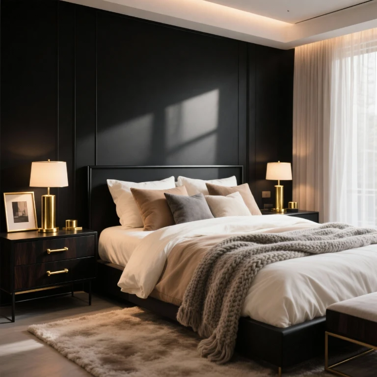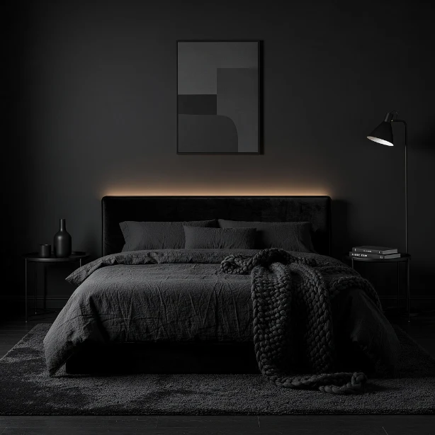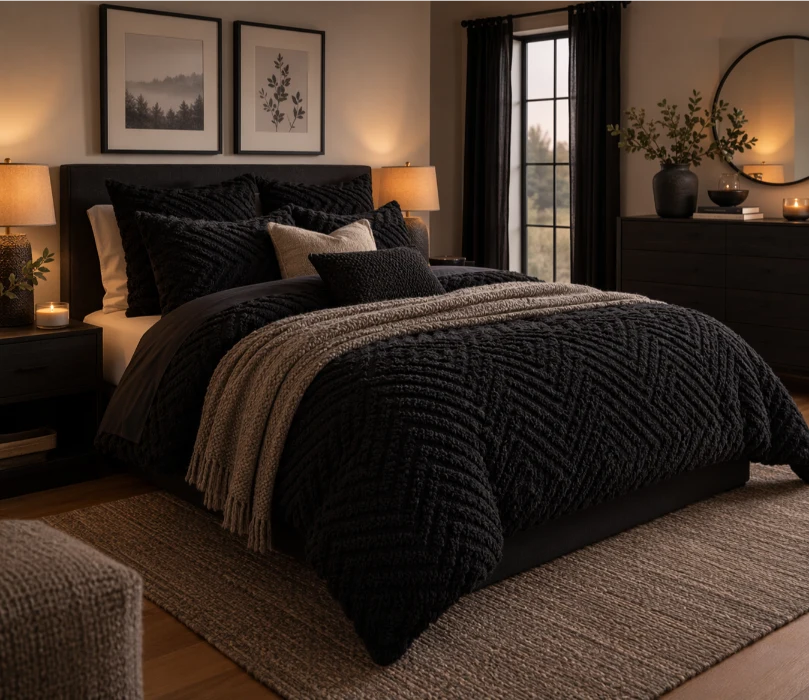 Black bedding creates a cozy, cocoon-like atmosphere. Mix textures like linen, cotton, and knit to add depth and visual interest. Layering prevents the space from feeling flat.