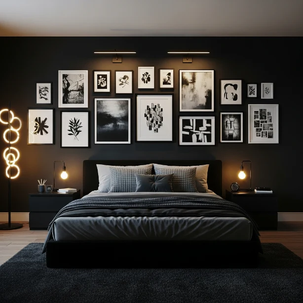 A gallery wall pops beautifully against black walls. Frames and artwork stand out dramatically, creating a stylish focal point. The contrast adds personality and charm.