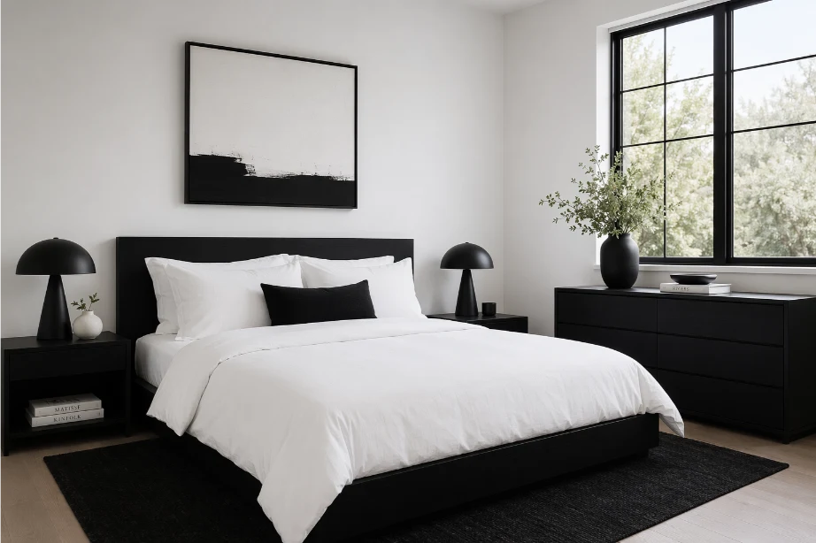 A black and white palette is timeless and effortlessly chic. Crisp white bedding pops against black walls or furniture, creating a striking contrast that feels fresh and modern. The simplicity keeps the room visually clean and calming.