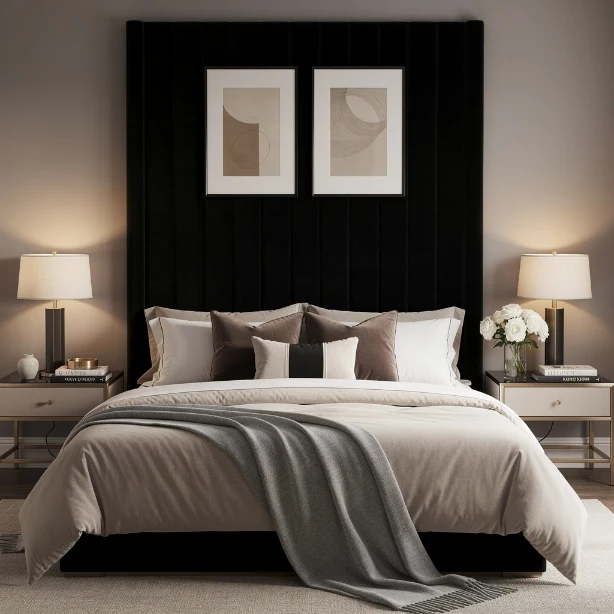 A black velvet headboard adds instant glamour and softness. The plush texture reflects light subtly, preventing the room from feeling flat. It creates a focal point that feels both cozy and upscale.