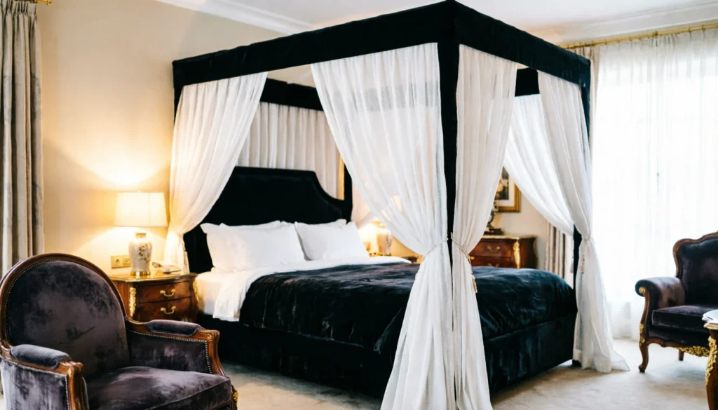 A black canopy bed brings drama and elegance to the bedroom. Its bold frame becomes an architectural feature that instantly elevates the space. Light curtains soften the strong lines beautifully.