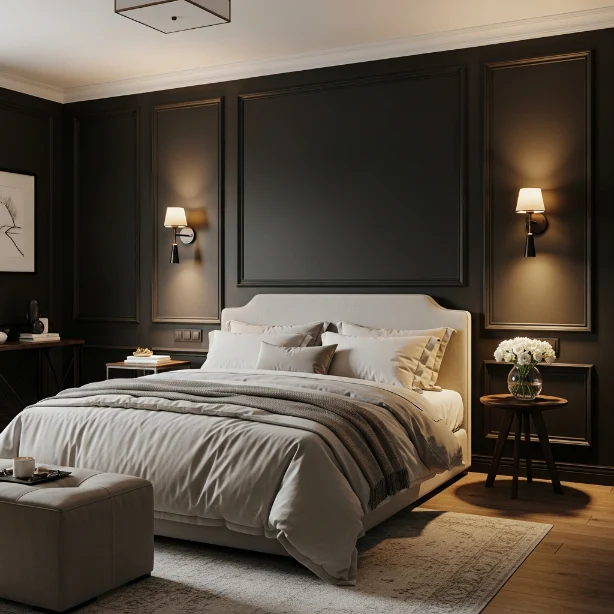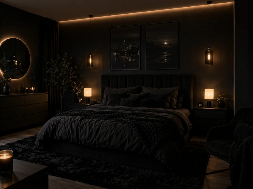 Lighting plays a huge role in dark bedrooms. Layered lighting—from bedside lamps to pendant lights—adds warmth and depth. Soft, warm bulbs prevent the room from feeling too dark.