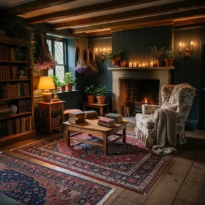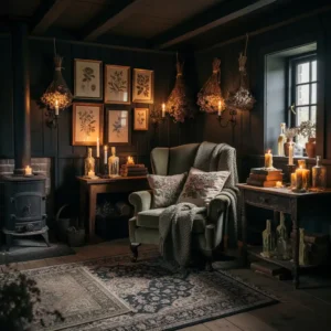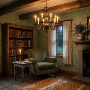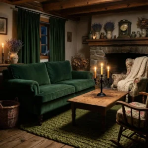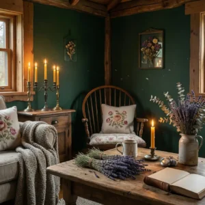 Pair forest green walls with antique wooden tables, layered rugs, and warm candlelight. Floral cushions or botanical artwork enhance the cottage aesthetic. This combination feels romantic, slightly mysterious, and deeply cozy—perfect for creating a storybook-inspired living room.