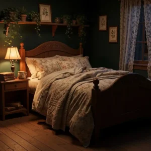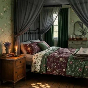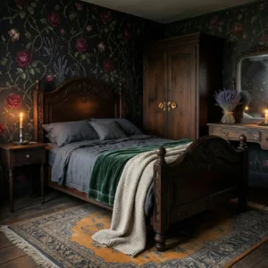 A gothic-inspired cottage bedroom blends romance with mystery. Dark walls and dramatic bedding create a cozy yet theatrical atmosphere. A canopy bed with soft drapes adds elegance and intimacy.