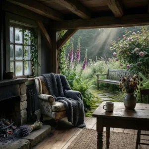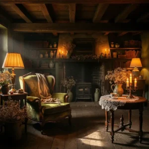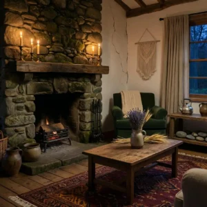 Decorate the mantel with vintage mirrors, dried flowers, or antique books. Warm firelight enhances the moody atmosphere. This feature captures the comforting charm of countryside living.