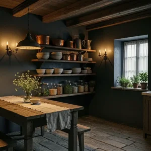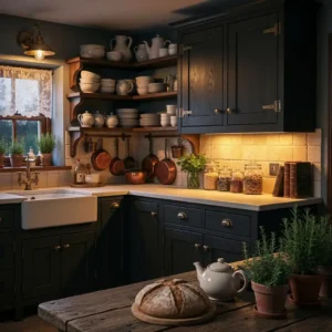 Balance darker walls with open shelving and lighter countertops. Display vintage ceramics and jars to maintain cottage charm. The result is a kitchen that feels both rustic and sophisticated.
