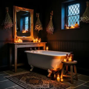 Add a clawfoot tub, brass taps, and candlelight for a romantic effect. Natural textures like wood and stone keep the space grounded.