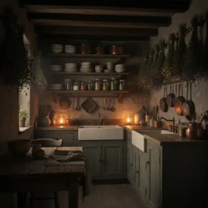 Balance darker cabinetry with warm lighting and natural textures. Open shelves with pottery or glass jars add charm and practicality. This style blends functionality with the moody cottagecore atmosphere.