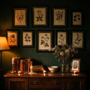 Place the gallery wall above a reading nook or sofa to create a focal point. Combine with candlelight and textured fabrics for added warmth. This design choice celebrates nature while maintaining the mysterious elegance of a moody home.
