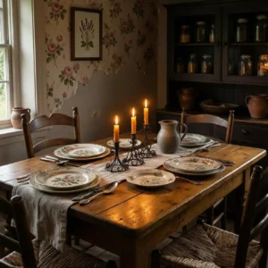 Candlelight plays a major role in dark cottagecore homes. A dining table illuminated by multiple candles creates a magical and intimate atmosphere. The soft glow enhances textures and deep colors throughout the room.