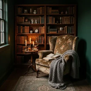 A cozy reading nook perfectly captures the spirit of cottagecore living. Dark-painted walls and soft lighting create an intimate atmosphere ideal for quiet moments. A vintage armchair and stacked books enhance the romantic aesthetic.