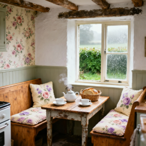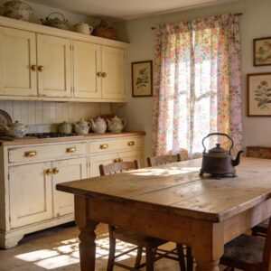 Balance patterned textiles with neutral cabinetry and natural materials. The subtle contrast keeps the kitchen charming yet refined. Floral accents connect the interior to garden landscapes, reinforcing the pastoral inspiration behind countryside design.