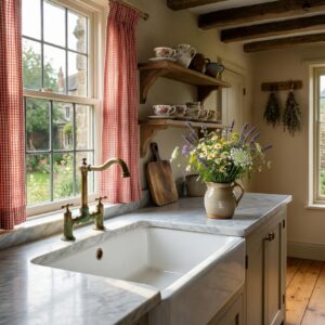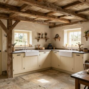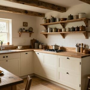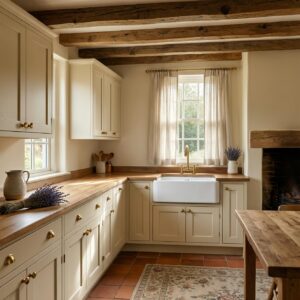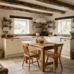 Balance the beams with neutral tones and simple finishes to maintain harmony. Stone flooring or wide-plank wood enhances the rural feel. The combination creates a cozy atmosphere that feels storied and authentic, perfect for a kitchen inspired by traditional English cottages.
