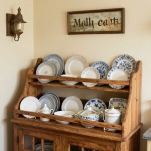 Choose simple wood finishes that coordinate with cabinetry. Keep plate arrangements cohesive in color for a curated look. This charming feature reinforces the traditional, homey atmosphere of an English countryside kitchen.
