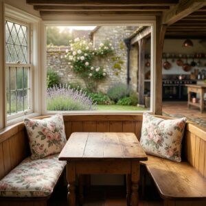 Floral fabrics bring a touch of romance to English countryside kitchens. Soft patterns on curtains, cushions, or seat pads introduce gentle color and character. Choose muted florals to maintain sophistication and avoid overwhelming the space.
