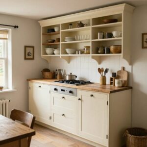 Open shelving adds both storage and character to a countryside kitchen. Displaying white ceramics, glass jars, and vintage crockery creates a relaxed, lived-in atmosphere. The open design keeps the room feeling airy and welcoming.