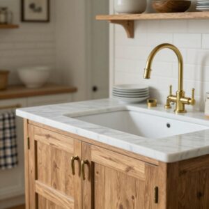 Surround the sink with marble or butcher block countertops for added warmth. Display fresh flowers or ceramic pitchers nearby to complete the look. This timeless element blends beauty and function, making everyday tasks feel a little more romantic and refined.