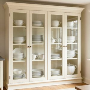 Glass-front cabinets add elegance while maintaining openness. Displayed dishes and glassware contribute to the kitchen’s personality and charm. The transparency keeps upper cabinetry from feeling heavy.