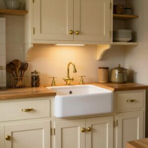 A farmhouse sink, often called an apron-front sink, is a defining feature in English countryside kitchens. Its deep basin and exposed front add practicality while serving as a charming focal point. Paired with a classic brass or bridge-style faucet, it enhances the kitchen’s heritage appeal.