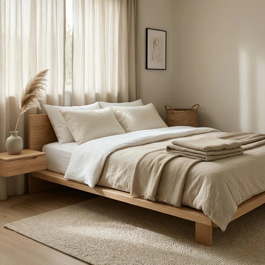 Balance with light wood and soft textiles. These small, intentional contrasts add depth and modernity to the Japandi aesthetic while keeping the room calm and cohesive.