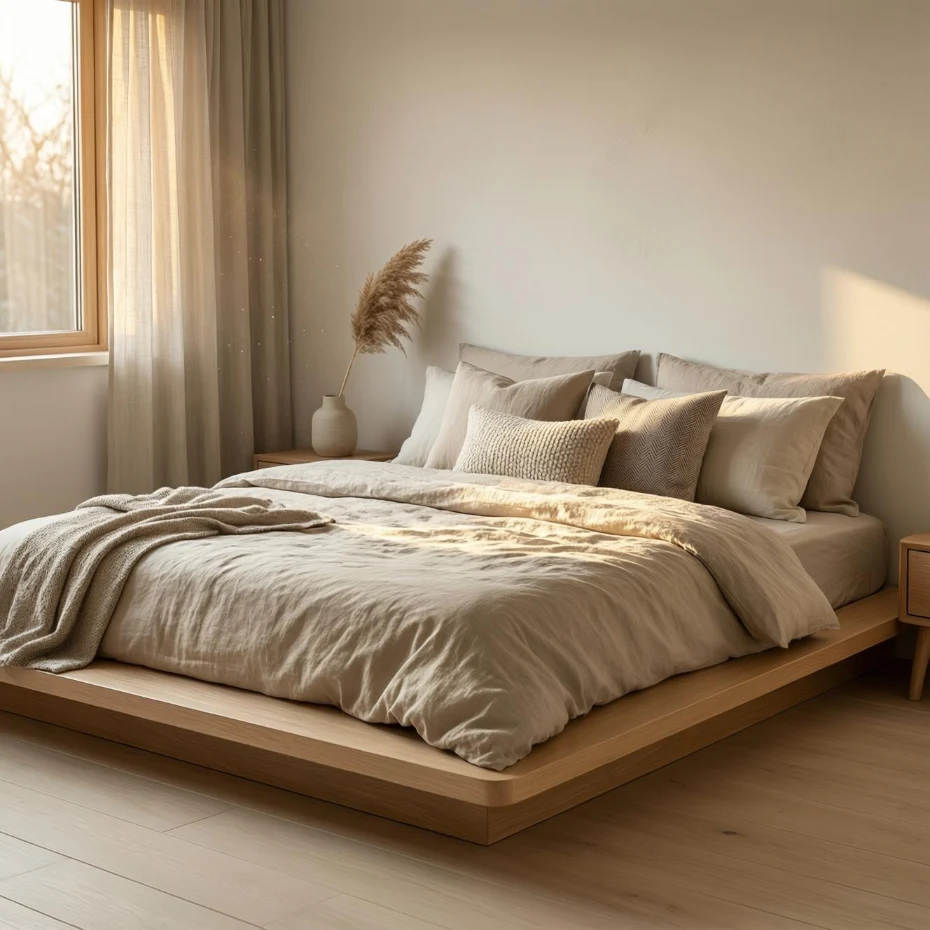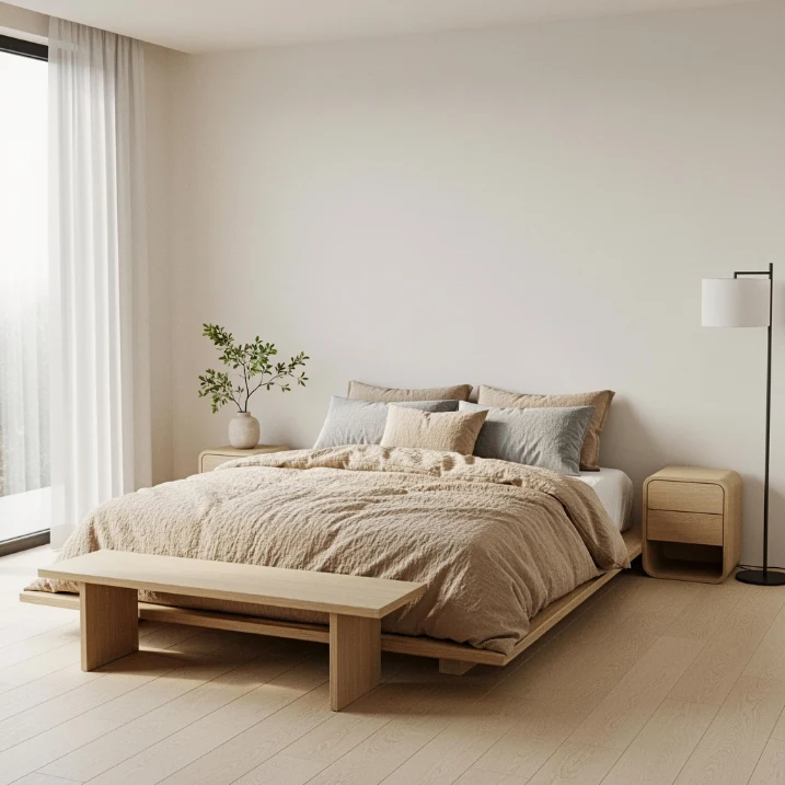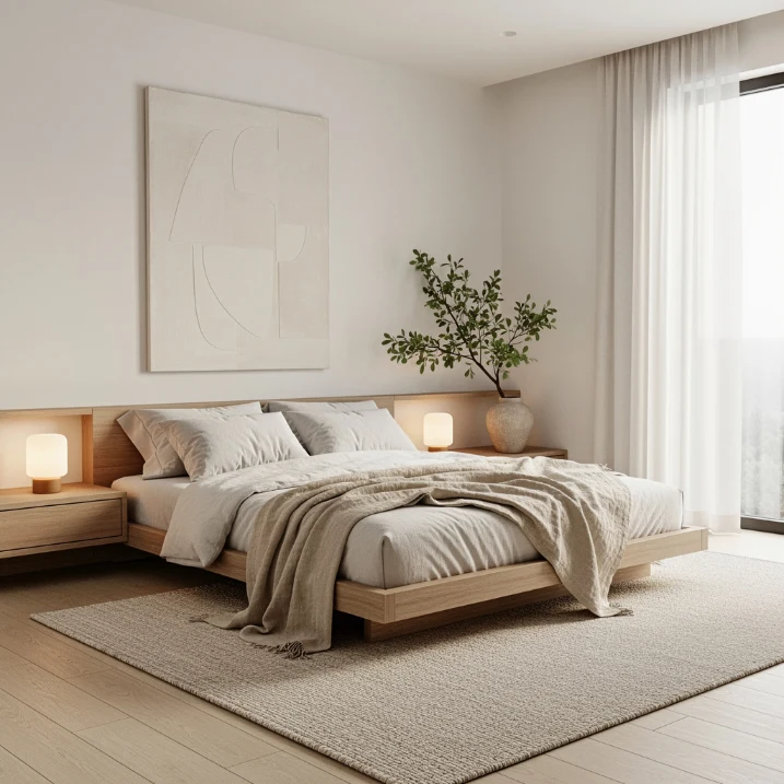 A low platform bed is both functional and visually grounding. Its clean lines complement the simplicity central to Japandi design while making the room feel open and airy. Neutral bedding enhances a restful atmosphere.