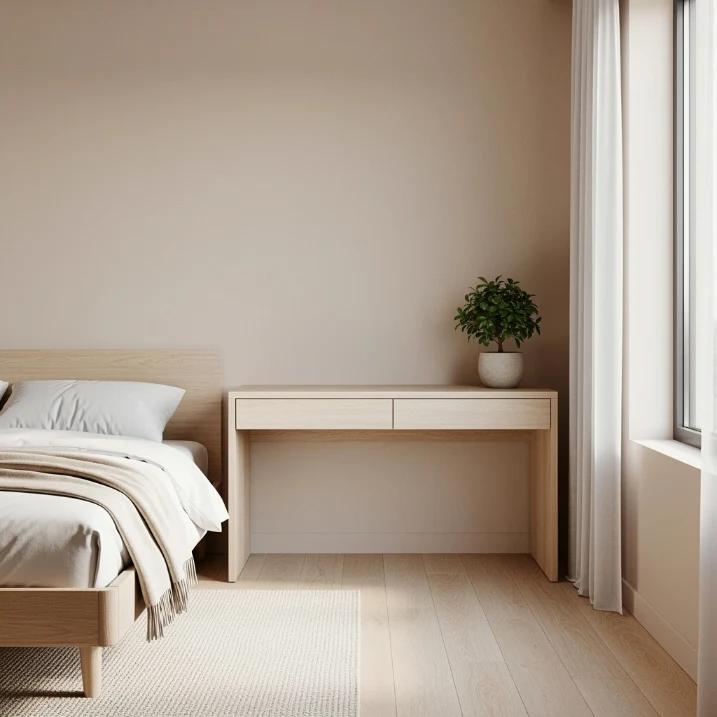 Keep accessories minimal—perhaps a small plant or simple lamp. The focus is on utility without clutter, blending practicality with calm aesthetics seamlessly.