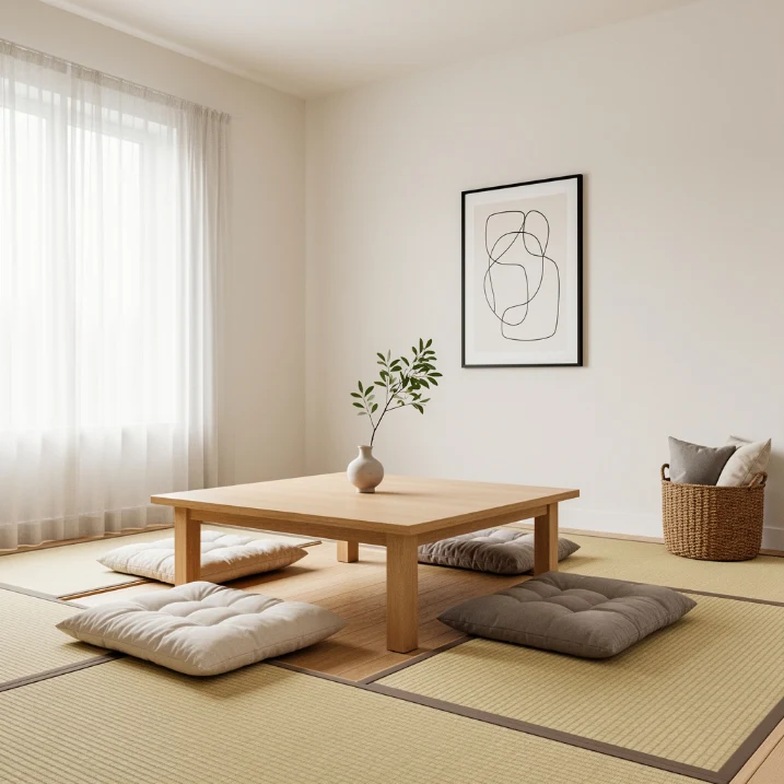 A low seating area inspired by tatami mats adds traditional Japanese touch. Simple cushions or floor seating create flexible spaces for reading or meditation.