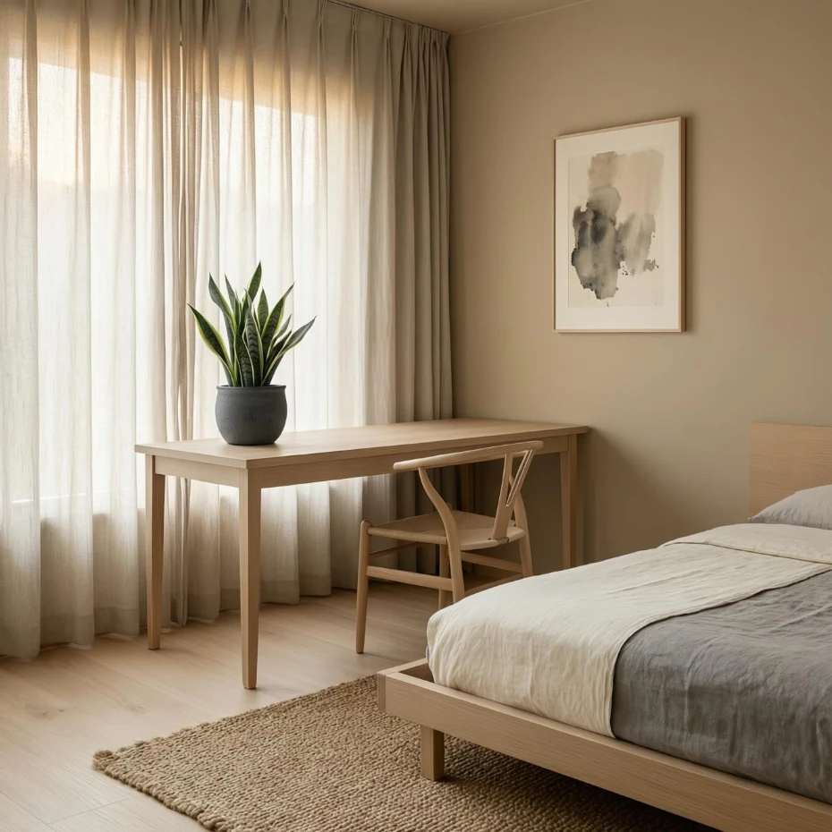A Japandi guest room thrives on neutral, calming tones. Soft shades of beige, cream, and muted gray create a serene backdrop that encourages relaxation. Light wood furniture and simple textiles enhance warmth while maintaining minimalism.