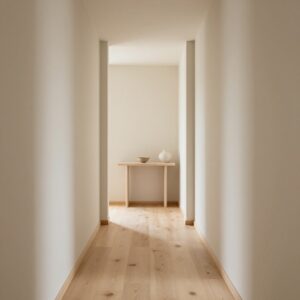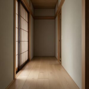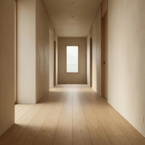 A Japandi hallway begins with a calm, neutral palette that instantly sets a peaceful tone. Soft beige, warm white, and muted greige walls create a clean backdrop that feels airy yet inviting. Light wood flooring enhances warmth while keeping the look minimal and refined.