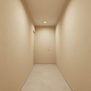 Image Prompt: Japandi minimalist hallway, clean surfaces, neutral tones, soft lighting