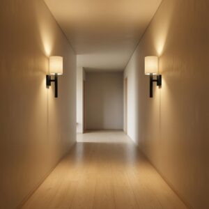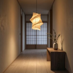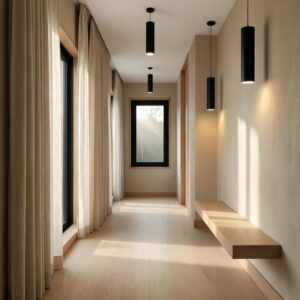 Lighting plays a crucial role in Japandi interiors. Warm, diffused wall sconces create a cozy glow that enhances neutral tones and natural textures. Soft illumination prevents the hallway from feeling cold or stark.