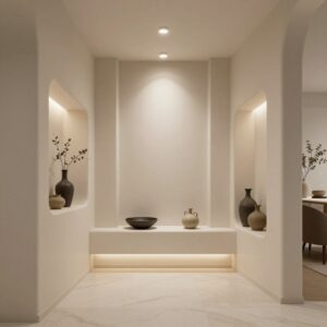 Keep arrangements minimal and intentional. Niches enhance architectural interest while preserving the hallway’s clean lines.