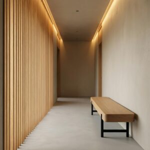 Vertical wood slats add texture and architectural interest without overwhelming a narrow hallway. The natural wood tone introduces warmth while maintaining the simplicity central to Japandi style. Clean lines create subtle visual rhythm and modern elegance.